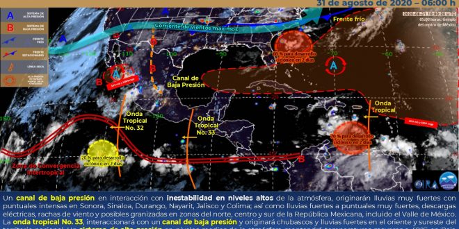 MÉRIDA, Yuc., 31 de agosto 2020.- En las próximas 24 horas, se prevé cielo despejado y nubosidad aislada con probabilidad para lloviznas, con temperaturas calurosas a muy calurosas durante el día y cálidas al amanecer.