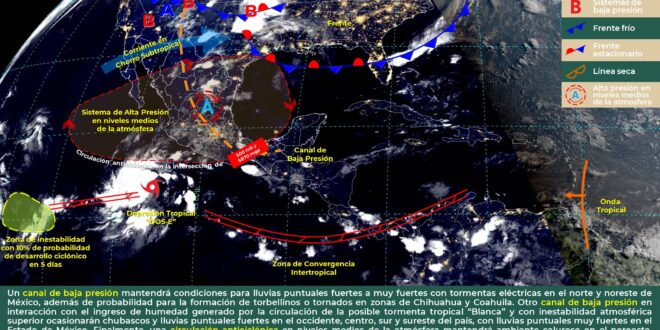 en interacción con una vaguada sobre la península de Yucatán, mantendrán la probabilidad para lluvias con intervalos de chubascos vespertinos en Yucatán, Campeche y Quintana Roo. Asimismo, se