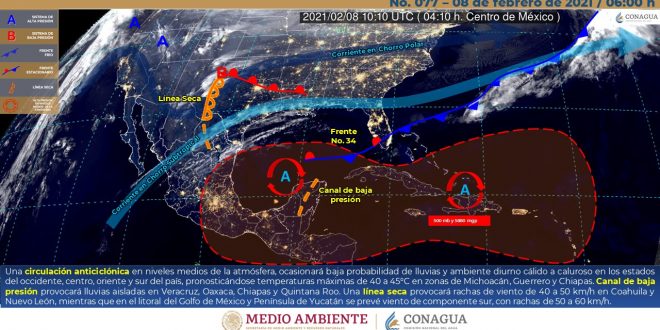 El ingreso de aire marítimo tropical proveniente del mar Caribe hacia la península de Yucatán, generará condiciones de cielo despejado y nubosidad dispersa con probabilidad para lloviznas en el norte, sur y costa de Quintana Roo, noreste y oriente de Yucatán, oriente y sur de Campeche. Asimismo, se prevén temperaturas calurosas a muy calurosas en el día y cálidas durante la madrugada, así como viento dominante de dirección sureste de 15 a 25 km/h y rachas de 40 km/h en zonas costeras.