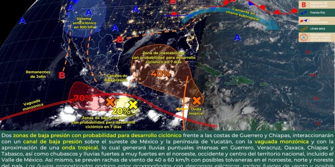Se prevé cielo parcialmente nublado a nublado, con probabilidad de tormentas fuertes a puntuales muy fuertes varias zonas de la península de Yucatán debido a la influencia de una nueva onda tropical. Ambiente cálido a caluroso durante el día