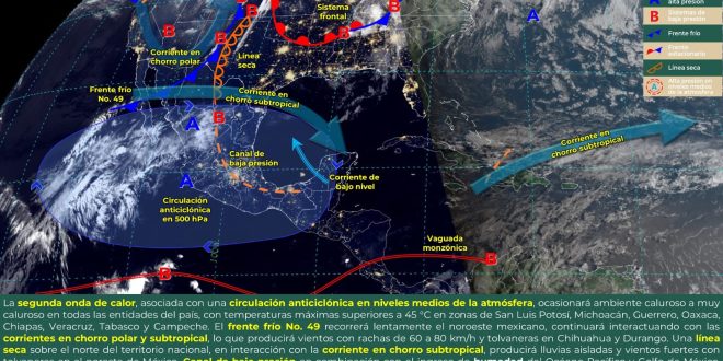 Se prevé cielo despejado a parcialmente nublado, sin probabilidad de lluvias, debido a una extensa circulación anticiclónica en niveles medios de la tropósfera, que se ubica sobre el centro de México. Ambiente caluroso a extremadamente caluroso durante el día y cálido en la noche. Vientos del este-sureste de 15 a 25 km/h, con rachas mayores a 40 km/h, tornándose del noreste y norte durante la tarde en la costa de Yucatán y Campeche, respectivamente.
