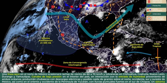 El ingreso de aire marítimo proveniente del mar Caribe y golfo de México, en interacción con una vaguada en la región, generarán condiciones de cielo despejado a parcialmente nublado con probabilidad para lluvias e intervalos de chubascos en el sur y oriente de Yucatán, así como chubascos en el sur y centro de los estados de Quintana Roo y Campeche. Ambiente caluroso a muy caluroso durante la tarde y cálido en la noche. Viento del este-noreste de 15 a 25 km/h y rachas