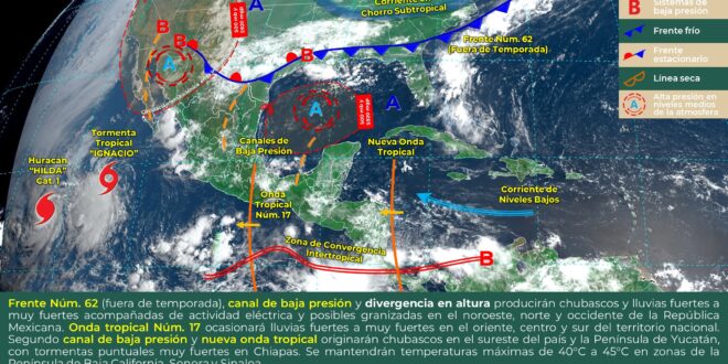 El establecimiento de una vaguada sobre la península de Yucatán en combinación con la cercanía de la onda tropical No. 18 en el golfo de Honduras, generarán probabilidad para intervalos de chubascos en el norte y sur de Quintana Roo, así como chubascos con tormentas puntuales fuertes en el norte, centro y suroeste de Yucatán, norte y sur de Campeche. Temperaturas calurosas a muy calurosas en el día y cálidas en la noche. Viento de dirección este-sureste cambiando al noreste de 15 a 25 km/h y rachas mayores a 40 km/h sobre zonas de costa y de tormenta.
