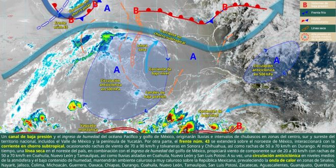 Estas condiciones son resultado del ingreso de aire marítimo tropical, el cual, al combinarse con el calentamiento diurno y la interacción con un canal de bajas presiones sobre el sureste del país, favorece el desarrollo de nubosidad y posibles lluvias ligeras aisladas en los tres estados de la región.