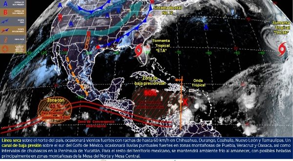 MÉRIDA, Yuc., 12 de noviembre 2020. – En las próximas 24 horas, se prevé cielo despejado a parcialmente nublado con probabilidad para lloviznas e intervalos de chubascos. Temperaturas cálidas a calurosas durante el día y templadas a cálidas al amanecer.
