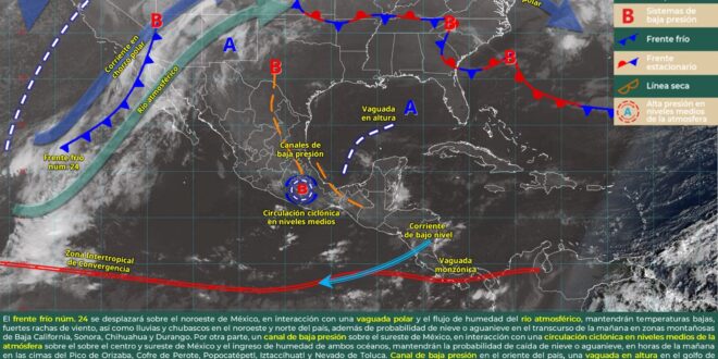 En las siguientes 24 horas, una vaguada en niveles superiores de la atmósfera favorecerá la ocurrencia de chubascos en el centro y sur del estado de Campeche, así como en el centro de Quintana Roo. Para Yucatán, se esperan lluvias aisladas en el noroeste, centro, oriente y sur del territorio estatal.