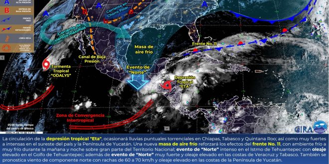 Se prevé que la extensa circulación de la Depresión Tropical Eta continúe inestabilizando e impulsando humedad hacia el interior de la región, por lo que se mantendrán las condiciones de cielo medio nublado a nublado en a mayor parte de la región, con probabilidad para intervalos de chubascos en el oriente, noroeste y sur de Yucatán, así como chubascos fuertes a localmente muy fuertes en el centro y sur de Campeche, mientras que en el centro y sur de Quintana Roo se esperan acumulados de lluvias fuertes a muy fuertes con puntuales intensas. Los vientos se mantendrán del norte-noreste con rachas de mayores a 55 km/h sobre la región costera de los tres estados, además de temperaturas cálidas a calurosas durante el día y templadas a cálidas al amanecer.