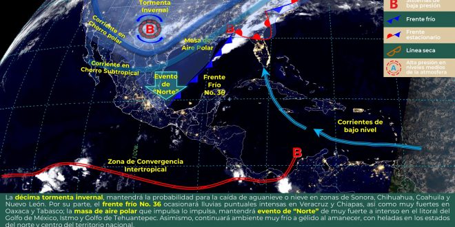 Se prevén condiciones de tiempo inestable debido al establecimiento de una vaguada inducida sobre el occidente de la península de Yucatán, asociado al acercamiento del frente frío No. 36, el cual se prevé que ingrese a la región poco antes del amanecer de mañana viernes. Tal condición provocará condiciones de cielo medio nublado a nublado, con probabilidad para tormentas fuertes especialmente en sectores del noroeste, centro y sur de Yucatán y el norte, centro y suroeste de Campeche, mientras que en el estado de Quintana Roo, se esperan lloviznas con chubascos aislados. En zonas de tormenta se pueden presentar rachas de viento fuerte, caída de granizo ocasional y descargas eléctricas.