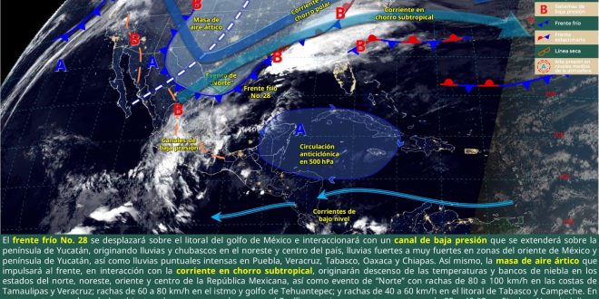 Se prevé que el frente frío No.28 se desplace sobre el golfo de México, hasta el sur de Veracruz, sin embargo, debido al establecimiento de un canal de bajas presiones, aunado al ingreso de aire marítimo tropical y el fuerte calentamiento diurno, se presenten condiciones favorables para el desarrollo de tormentas con acumulados de lluvias fuertes a muy fuertes en los estados de Campeche y Yucatán, mientras que en Quintana Roo se esperan lloviznas con chubascos vespertinos. El ambiente será cálido a caluroso durante el día y cálido en la noche, con vientos del este-sureste de 15 a 25 km/h y rachas mayores 35 km/h en zonas