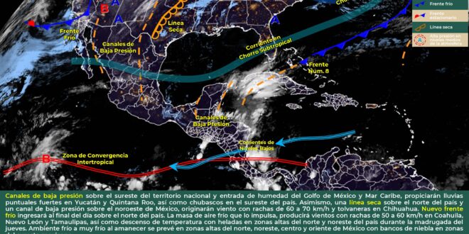 Se prevé que se presenten condiciones de cielo medio nublado a nublado, con probabilidad para intervalos de chubascos con tormentas en sectores del oriente, centro y norte de Yucatán y el centro y norte de Campeche, mientras que a lo largo de la costa de Quintana Roo se esperan lluvias de fuertes a localmente muy fuertes, esto debido al establecimiento de un canal de bajas presiones sobre la región aunado al ingreso de aire marítimo tropical. Las temperaturas serán cálidas a calurosas durante el día y templadas en la madrugada. Viento del este-noreste de 15 a 25 km/h y rachas de 40 km/h en zonas costeras.