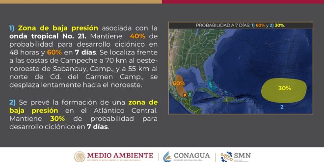 Zona de baja presión con potencial ciclónico se desplaza sobre la península de Yucatán, asimismo la onda tropical núm. 21 sobre el occidente de la región,