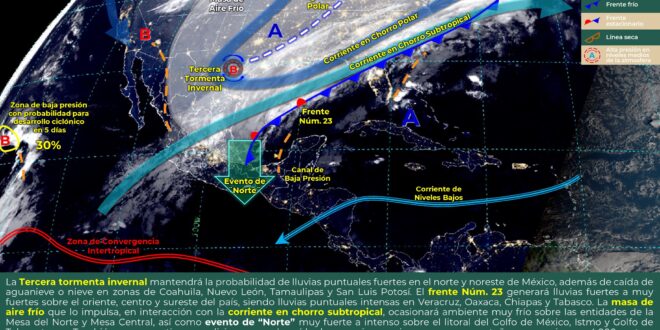Se prevé que dentro de las próximas 24 horas, el frente frío no. 23 se extenderá sobre el centro y sur del golfo de México, ocasionando un canal de baja presión hacia la península de Yucatán; además se prevé el ingreso de aire cálido y húmedo que favorecerá el desarrollo de nublados asociados a chubascos y tormentas fuertes en el centro y sur de Quintana Roo, oriente, norte-centro y sur de Yucatán, así como en el centro y sur de Campeche. El viento será del sureste cambiando del noroeste de 15 a 25 km/h y rachas mayores de 50 km/h sobre la costa de Yucatán y Campeche y se espera que las temperaturas sean de cálidas a calurosas durante el día y de templadas a cálidas por la noche.