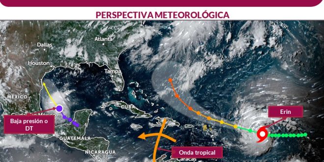 Asimismo, la tormenta tropical “Erin” se localiza a más de 3,000 kilómetros al este de Yucatán, con pronóstico de desplazamiento mar adentro sobre el Atlántico, sin afectar a la Península.
