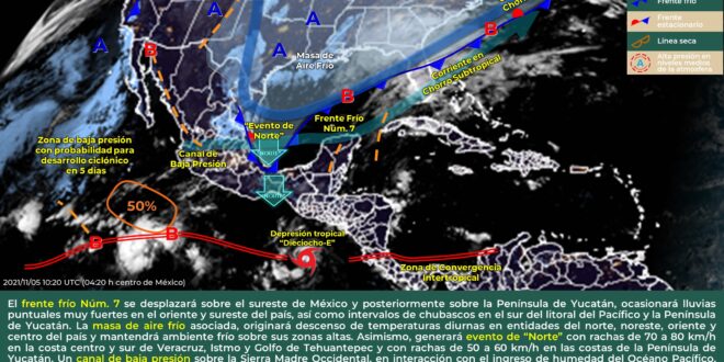 Se prevé que durante este día, el frente frío No.7 se desplace sobre el golfo de México y llegue a la península de Yucatán. Mientras tanto un canal de baja presión se extenderá en la región favoreciendo condiciones de cielo medio nublado con probabilidad de intervalos de chubascos en el norte, noreste y oriente de Yucatán, así como en el sur de Campeche y en el norte y centro de Quintana Roo. Las temperaturas serán cálidas a calurosas durante el día y de templadas a cálidas al amanecer, con viento del norte-noroeste de 15 a 25 km/h y rachas de hasta 40 km/h.