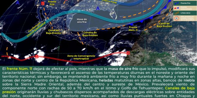 El sistema frontal No. 11 dejará de afectar la península de Yucatán, sin embargo, su vaguada y masa de aire frio, favorecerá nublados con probabilidad para lloviznas e intervalos de chubascos en el noreste de Yucatán, suroeste de Campeche, así como en el norte y centro de Quintana Roo. Asimismo, se pronostican temperaturas cálidas a calurosas durante el día y templadas a cálidas al amanecer. Viento de dirección norte-noreste de 15 a 20 km/h y rachas de 40 km/h en zonas costeras de Yucatán y Campeche.