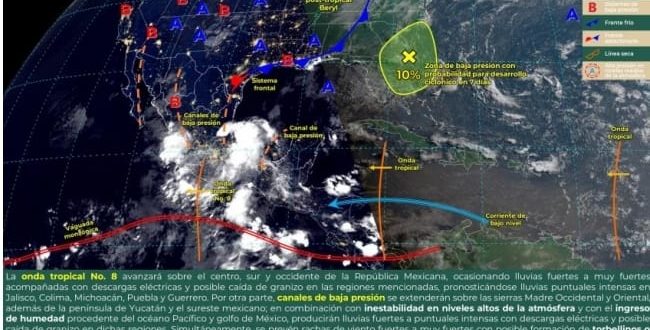 Se prevé que debido al ingreso de aire marítimo tropical en combinación con el calentamiento diurno, se presentarán condiciones de cielo medio nublado, con probabilidad de chubascos dispersos en Yucatán y Quintana Roo, mientras que en Campeche se esperan largos periodos de sol, con lloviznas aisladas en el centro y sur del estado. Ambiente caluroso a muy caluroso en el día y cálido durante la noche. Viento del este-sureste cambiando al este-noreste con rachas mayores a 40 km/h en zonas costeras. La onda tropical No.9 se aproximará a la costa de Quintana Roo al final del este día.