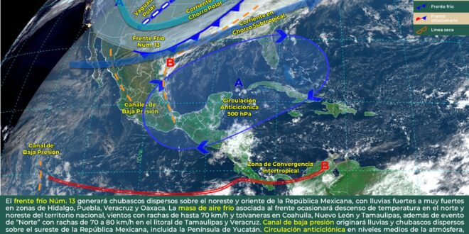 mañana, sin embargo, una vaguada extendiéndose al suroeste de la península de Yucatán, estará generando lloviznas dispersas al norte y noroeste de Yucatán, suroeste de Campeche, así como en el centro y sur de Quintana Roo. Las temperaturas serán calurosas durante el día y templadas al amanecer. Viento soplando del este-sureste de 15 a 25 km/h, cambiando al noreste con rachas de 40 km/h en costas.