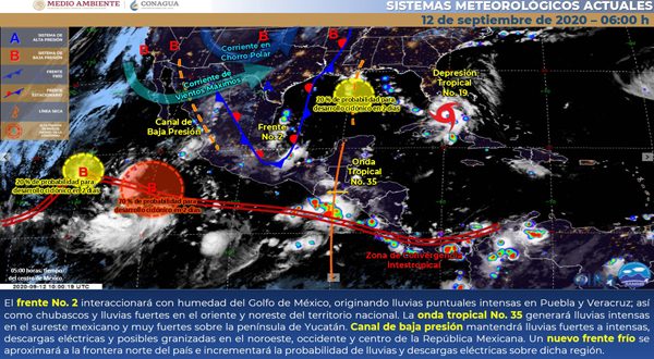 El paso de la onda tropical No. 35 sobre la península de Yucatán, favorecerá aumento de nublados con probabilidad de lluvias a partir del medio día; siendo chubascos fuertes en el oriente, centro y noroeste de Yucatán, norte y sur de Quintana Roo, así como chubascos fuertes a muy fuertes centro y sur de Campeche. Además, las temperaturas a lo largo de este día serán calurosas a muy calurosas especialmente en los estados de Campeche y Yucatán, con vientos dominantes del este- noreste y norte-noroeste de 15 a 20 km/h y rachas que podrían alcanzar los 40 km/h en zonas costeras.