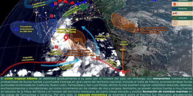 Quintana Roo debido a un sistema de baja presión sobre la península de Yucatán, con potencial de desarrollo ciclónico, en interacción con la vaguada monzónica, extendida sobre los estados del Pacífico mexicano. El ambiente será cálido a caluroso durante el día y cálido en la noche, con vientos del este-sureste de 20 a 40 km/h y rachas mayores a 50 km/h.