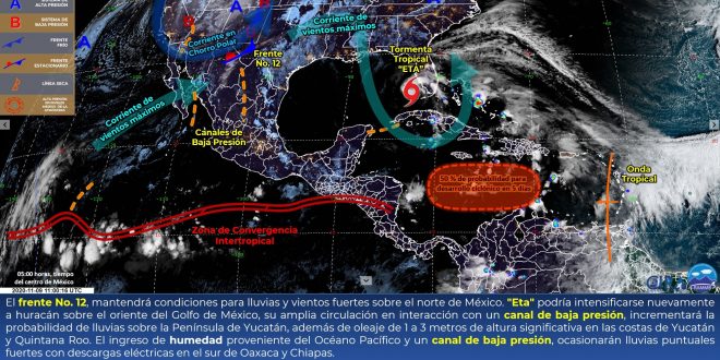 Se prevé que la circulación de la tormenta tropical ”Eta” frente a la costa de península de la Florida,E.U.A. y oriente del golfo de México, continúe aportando humedad hacia la península de Yucatán, generando probabilidad para lloviznas e intervalos de chubascos en el norte y centro de Quintana Roo, noreste y oriente de Yucatán, así como lloviznas e intervalos de lluvia aislada en el norte, oriente y sur de Campeche; en el resto de la región se prevé cielo despejado. Viento dominante de dirección oeste-noroeste de 15 a 25 km/h y rachas mayores a 45 km/h sobre la costa de Yucatán y Quintana Roo. Temperaturas cálidas a calurosas en el día y templadas a cálidas durante la madrugada.