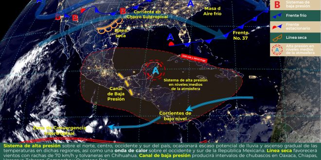Se prevé que predominen condiciones de tiempo estable en la mayor parte de la región debido al dominio del amplio sistema anticiclónico que cubre el centro-sur y sureste del territorio nacional, sin embargo, el ingreso de aire cálido y húmedo proveniente del mar Caribe hacia el interior de la península, propiciará condiciones de cielo parcialmente nublado con probabilidad para lloviznas con chubascos aislados al oriente y noreste de Yucatán, sur de Campeche y porción sur de Quintana Roo. Las temperaturas serán templadas a cálidas en la madrugada y cálidas a calurosas durante el día, con viento del este cambiando al noreste de 15 a 25 km/h y rachas mayores a 45 km/h en la costa de Yucatán y Campeche.