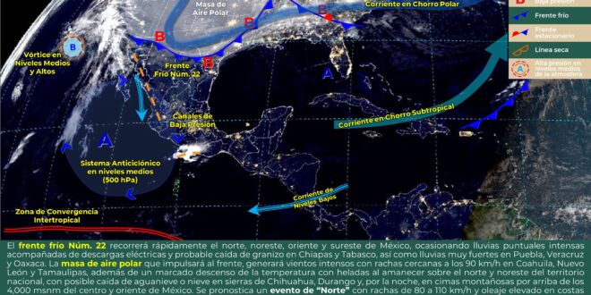 Una vaguada inducida al occidente de la península de Yucatán, asociada a un nuevo frente frio No. 22, el cual se desplazará sobre el golfo de México, estará ocasionando chubascos nocturnos en el noreste y oriente de Yucatán, suroeste de Campeche, así como lloviznas en el resto de la región. Asimismo, se pronostican temperaturas cálidas durante el día y de frías a frescas en la madrugada. Viento dominante del norte-noreste de 15 a 25 km/h y rachas mayores a 40 km/h sobre la costa de Yucatán y Campeche.