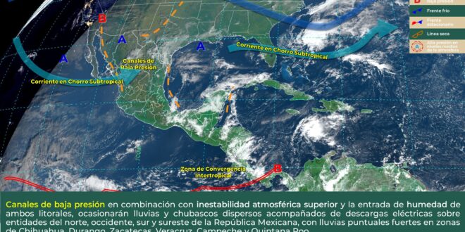 Se prevé que debido a la persistencia de una vaguada sobre el oriente de la región, en combinación con el ingreso de aire marítimo tropical, mantendrán condiciones de cielo medio nublado a nublado, con probabilidad para intervalos de chubascos en el centro y sur de Campeche, así como lluvias localmente fuertes en el oriente y sur de Yucatán y de fuertes a localmente muy fuertes en el norte y centro de Quintana Roo. Asimismo, se prevén temperaturas cálidas a calurosas durante el día y de frescas a templadas al amanecer, con viento de dirección noreste de 15 a 25 km/h y rachas de 40 km/h principalmente en costas de Yucatán y Campeche.