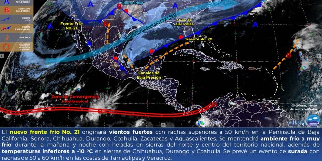 Se prevé que el frente No.20 continúe con características de estacionario y en proceso de disipación sobre el suroeste del golfo de México; mientras tanto, en la península de Yucatán, predominará tiempo estable con cielo parcialmente nublado y baja probabilidad de lluvias. Asimismo, se prevén temperaturas cálidas a calurosas durante el día y templadas a cálidas al amanecer, con vientos del este-sureste de 15 a 25 km/h y rachas de hasta 40 km/h en zonas costeras.