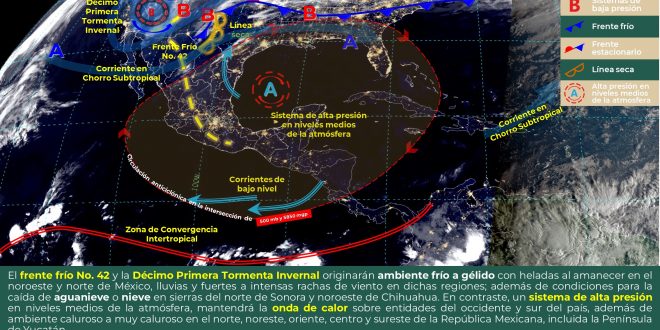El anticiclónico en niveles superiores dominará sobre la península de Yucatán y la entrada de humedad del mar Caribe favorecerá probabilidad de lloviznas al centro y sur de Quintana Roo, para el resto de la región no se prevén lluvias. Las temperaturas serán calurosas a muy calurosas en el día y templadas a cálidas al amanecer, además el viento dominante del este- sureste de 20 a 30 km/h y rachas de 50 km/h en Yucatán y Quintana Roo.