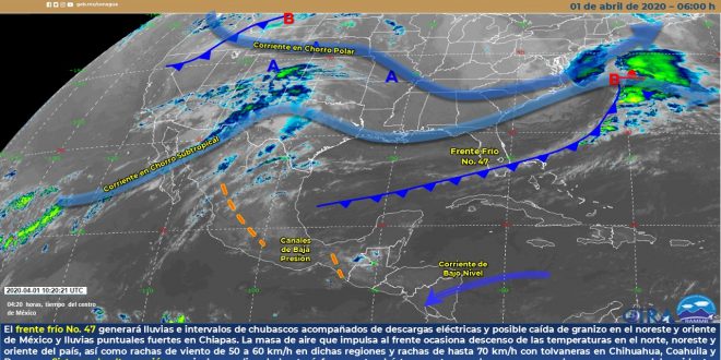 Se prevé que durante las próximas horas, el frente frío No.47 se desplace hasta el sur del golfo de México, donde se moverá lentamente hacia el norte de la península de Yucatán, previéndose que ubique sobre la costa de Yucatán y norte de Quintana Roo durante la mañana de este jueves. Mientras tanto, la influencia de este sistema y su vaguada asociada, favorecerán el desarrollo de cielo medio nublado a nublado en la región, con probabilidad para intervalos de chubascos principalmente en sectores del norte y centro de Quintana Roo, así como en el noreste, oriente y centro de Yucatán, así como en el norte y sur de Campeche. Asimismo, las temperaturas serán muy calurosas a extremadamente calurosas durante el día y cálidas al amanecer, los vientos en la costa de Quintana Roo se mantendrán del este-sureste de 15 a 25 km/h, mientras que en los estados de Campeche y Quintana Roo serán del noreste con rachas de hasta 45 km/h.