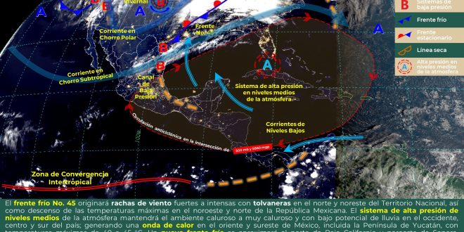 Se prevé que continúen presentándose condiciones de tiempo estable sin probabilidad para lluvias en la mayor pate de la región, debido al dominio anticiclónico que sigue cubriendo el centro, sur y sureste del territorio nacional y golfo de México. Asimismo, las temperaturas serán muy calurosas en el día y cálidas al amanecer, con viento dominante de dirección sureste de 20 a 30 km/h y rachas mayores a 50 km/h (surada) principalmente al norte y costa de Yucatán y la costa de Quintana Roo.