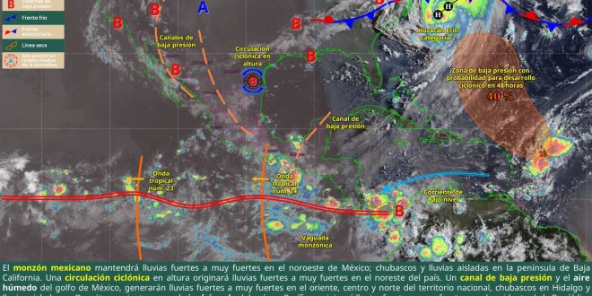 En Yucatán y Campeche se prevén tormentas puntuales fuertes, mientras que en Quintana Roo se esperan chubascos con tormentas dispersas. En los sitios donde se desarrollen estas lluvias podrían presentarse descargas eléctricas abundantes y vientos fuertes.