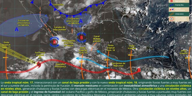 El pronóstico emitido señala que estas condiciones se deben al paso de la onda tropical número 18, que avanza por el sur de la región, en combinación con una vaguada inducida por el calentamiento diurno y una zona de inestabilidad en niveles altos de la atmósfera. Estas condiciones favorecerán lluvias significativas en Yucatán y Campeche, mientras que en Quintana Roo se esperan chubascos acompañados de tormentas.