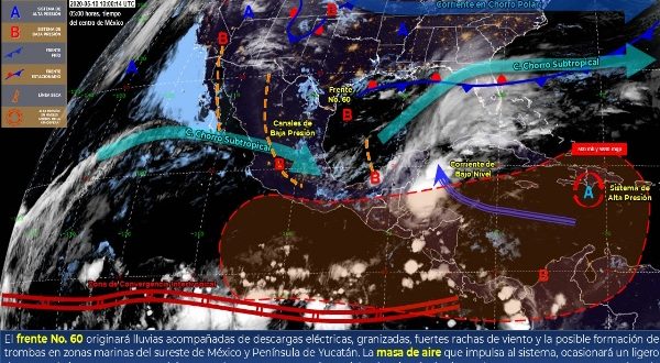 Un canal de bajas presiones sobre la península de Yucatán y la cercanía del sistema frontal No. 60 generarán nublados convectivos con probabilidad de tormentas fuertes a muy fuertes en el noreste, oriente y sur de Yucatán, sur de Campeche, así como en el norte y sur de Quintana Roo. Las temperaturas serán calurosas a muy calurosas durante el día y cálidas en la noche, con viento del norte-noreste 20 a 30 km/h y rachas superiores a 50 km/h en zonas de costa.