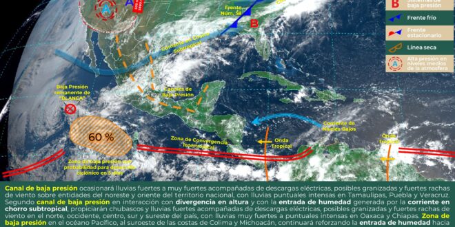 vaguada sobre el centro y occidente de la península de Yucatán y ocasionaría el desarrollo de nublados con probabilidadd de chubascos con tormentas puntuales fuertes en el norte-centro, noroeste y sur de Yucatán, así como en el norte y centro de Campeche. A pesar de dicha situación, las temperaturas serán muy calurosas durante el día y cálidas por la noche.