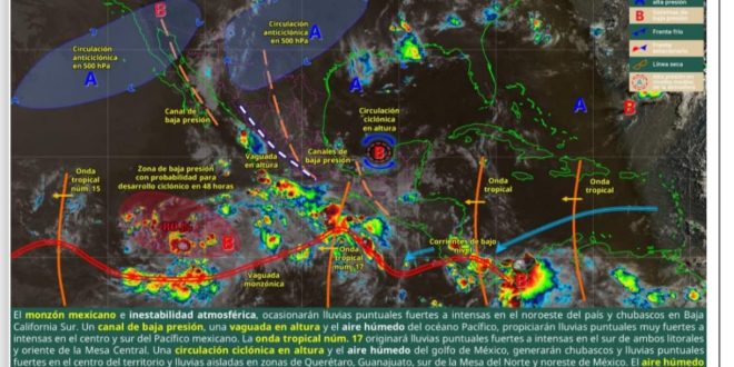 El incremento en el potencial de lluvias obedece a la influencia de la onda tropical No. 17, combinada con un vórtice en niveles altos de la atmósfera, lo que generará precipitaciones importantes principalmente en los estados de Campeche y Yucatán. En Quintana Roo, se esperan chubascos con tormentas de intensidad fuerte.
