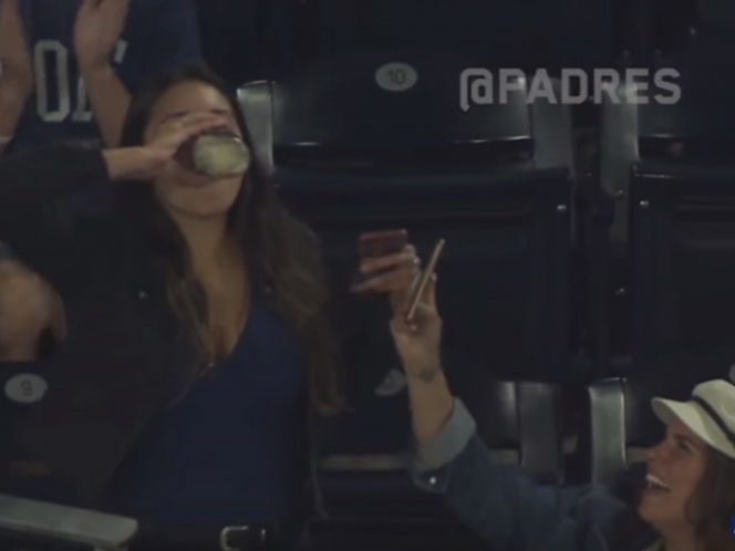 Para completar la jugada, la fanática de los Padres celebró su gran atrapada dándole un buen sorbo a su bebida.