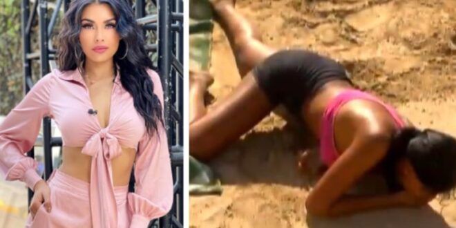 En la grabación que fue difundida por el programa matutino ‘Venga la Alegría’ se puede apreciar el momento justo en que la modelo sufre un fuerte encontronazo con su excompañero de tribu Sargento Rap, quien resbala y la golpea con el hombro izquierdo justo en el rostro.