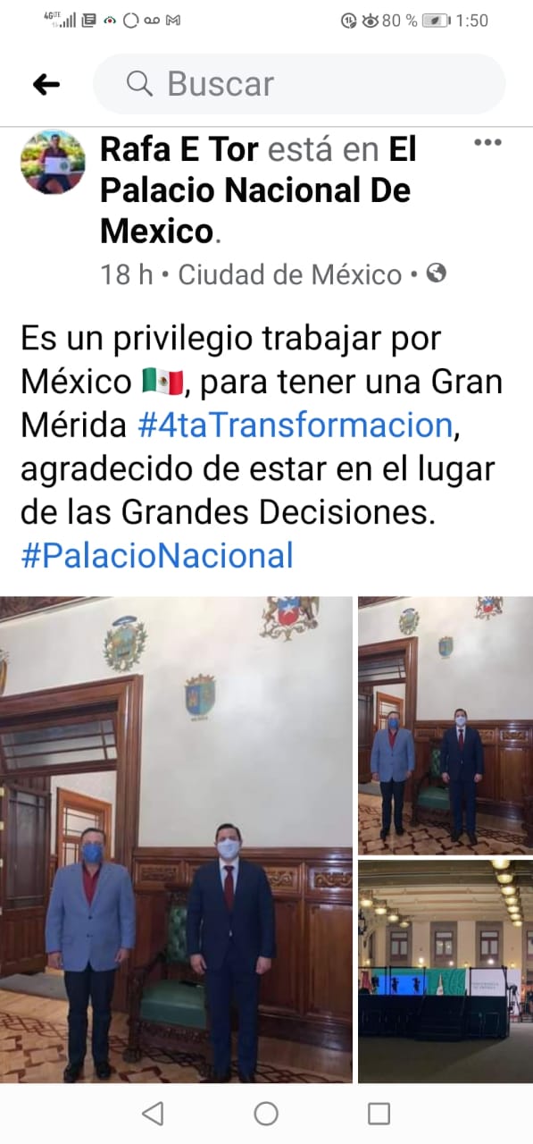 MÉRIDA, Yuc., 25 de febrero 2021. – En sus redes sociales uno de los aspirantes, que lideran el proceso de Morena, para la Alcaldia de Merida, Rafael EchazarretaTorres, compartió ayer, fotos de la visita que realizaba a Palacio Nacional en la Ciudad de México, ¿Cuál habrá sido el motivo? ¿Quién lo habrá invitado? ¿ Con quién se habrá reunido? Por qué sale tan sonriente?