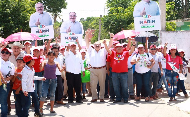 Con porras de “¡Marín!, ¡Marín!”, “¡Arriba Irene!, ¡Arriba Irene!”, y “¡Vamos a ganar!, ¡Vamos a ganar!”, transcurrió la caminata bajo el fuerte sol en Chacsinkín, el primer punto de su recorrido por el Sur, donde el aspirante al Senado acompañó a la candidata a la alcaldía Irene Ku Ku, ama de casa, mayahablante, quien por primera vez participa en política.