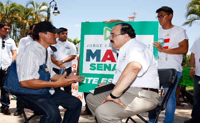 De buen ánimo y dispuesto a escuchar a los yucatecos, Jorge Carlos Ramírez Marín, candidato a senador, atendió en la Plaza Grande de Mérida a numerosos vecinos que acudieron a plantearle alguna inquietud, propuesta o solicitud, en lo que fue su primera audiencia ciudadana en las plazas públicas de Yucatán.