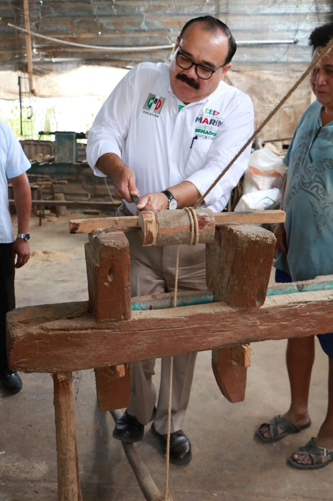 El candidato visitó el pequeño museo de sitio, ubicado en el local del comisariado y el taller “Artesanías de Dzityá”, donde Marcos Chí Pisté le enseñó un torno rústico de madera y soga de henequén, que les heredó su bisabuelo, el tallador de madera y piedra Marcos Pisté Couoh, quien, según dijo, trabajó con el escultor Rómulo Rozo en la majestuosa obra del Monumento a la Patria.
