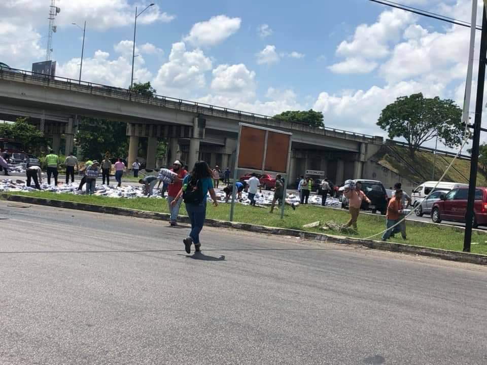 Un cargamento con latas de cerveza quedó regado sobre el Periférico de Mérida en su cruce con la carretera a Caucel, lo cual fue aprovechado por transeúntes y guiadores quienes cometieron actos de rapiña.