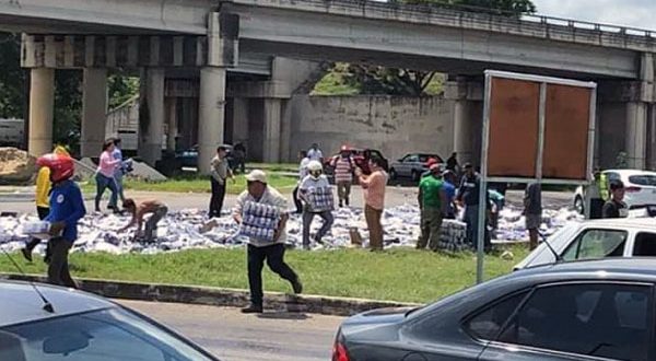 Un cargamento con latas de cerveza quedó regado sobre el Periférico de Mérida en su cruce con la carretera a Caucel, lo cual fue aprovechado por transeúntes y guiadores quienes cometieron actos de rapiña.
