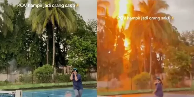 Nana, conocida en la plataforma como @nfianas, practicaba en una cancha de tenis en Banjarnegara cuando un rayo impactó un árbol cercano. Las imágenes muestran el estruendo y cómo el árbol se envuelve en llamas y humo.