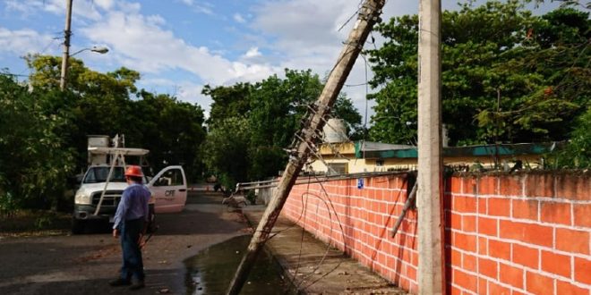 Con la vespertina lluvia que cayó ayer en Mérida un rayo le “pegó” a un poste de la Comisión Federal de Electricidad (CFE), que al partirse a la mitad y jalar el cableado provocó que otro se viniera abajo.