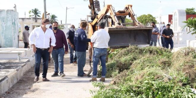 Progreso, Yucatán a 28 de Septiembre de 2021.- El alcalde Julián Zacarías Curi, acompañado del director de servicios públicos, Canan Góngora Ortegón, supervisaron los trabajos que se realizan en el cementerio municipal, ubicado en la colonia Vicente Guerrero.