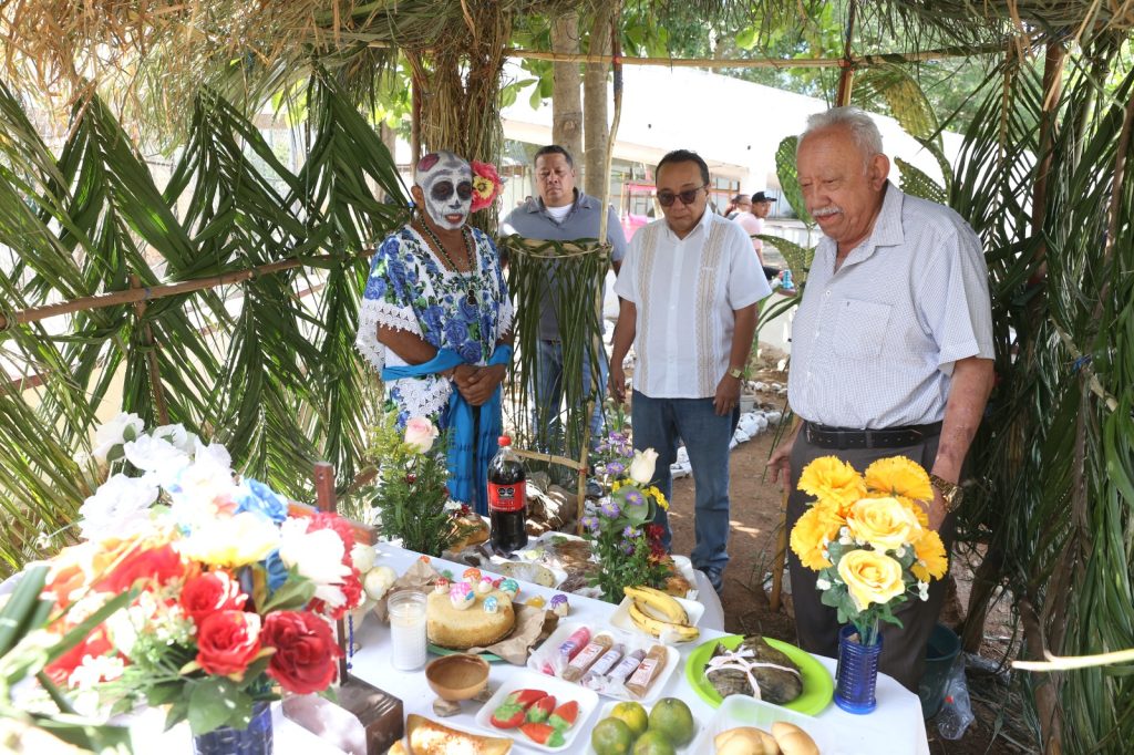 Las ofrendas incluyeron flores de temporada como el xtee o cresta de gallo, xpujuc o cosmos amarillo, amor seco y cempasúchil; además de xec de frutas, dulces típicos yucatecos y platillos tradicionales como el pib y el relleno negro. Como marca la costumbre, también se colocaron fotografías, velas, cruces y manteles blancos en honor a los seres queridos que partieron.