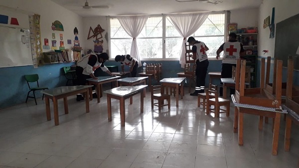 Previo a la llegada del huracán y como parte de la labor humanitaria se realizó la limpieza de la escuela primaria Benito Juárez García que fue habilitada como albergue temporal para las familias de las zonas costeras.