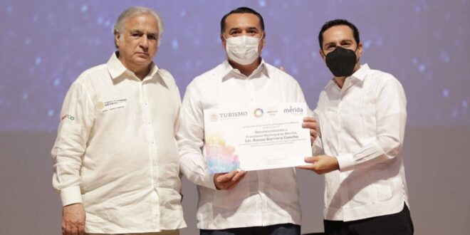 Previamente, el Alcalde, Renán Barrera Concha, recibió de manos del secretario de Turismo Federal, Miguel Torruco Marqués, y del gobernador de Yucatán, Mauricio Vila Dosal, un reconocimiento por la instalación del único stand inclusivo en este evento, el cual contempló varios elementos que hicieron accesible este espacio para todas y todos.
